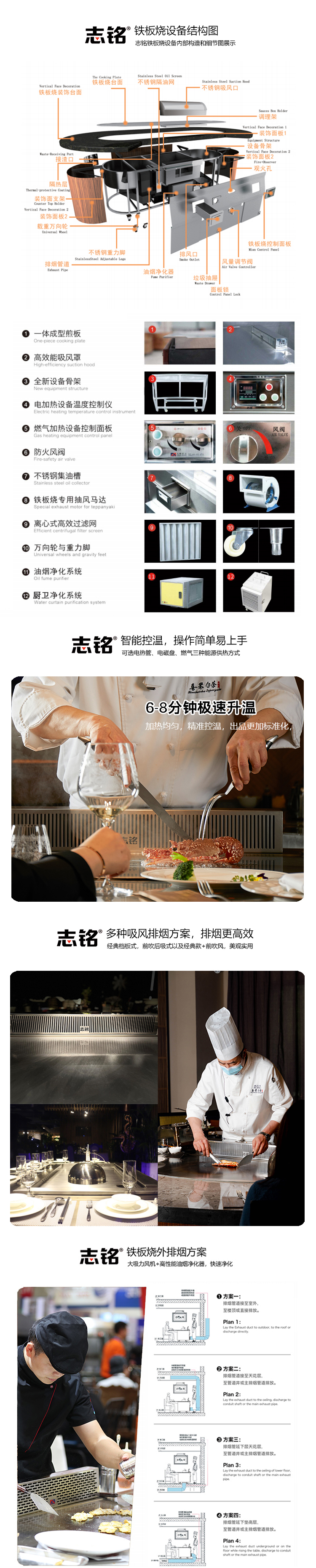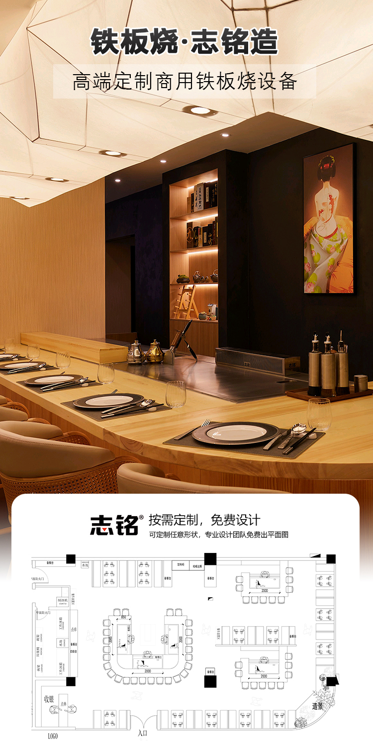 志銘定制增加燒烤臺,烤串架的鐵板燒設(shè)備,適合鐵板燒自助餐廳、明檔操作臺等場景。